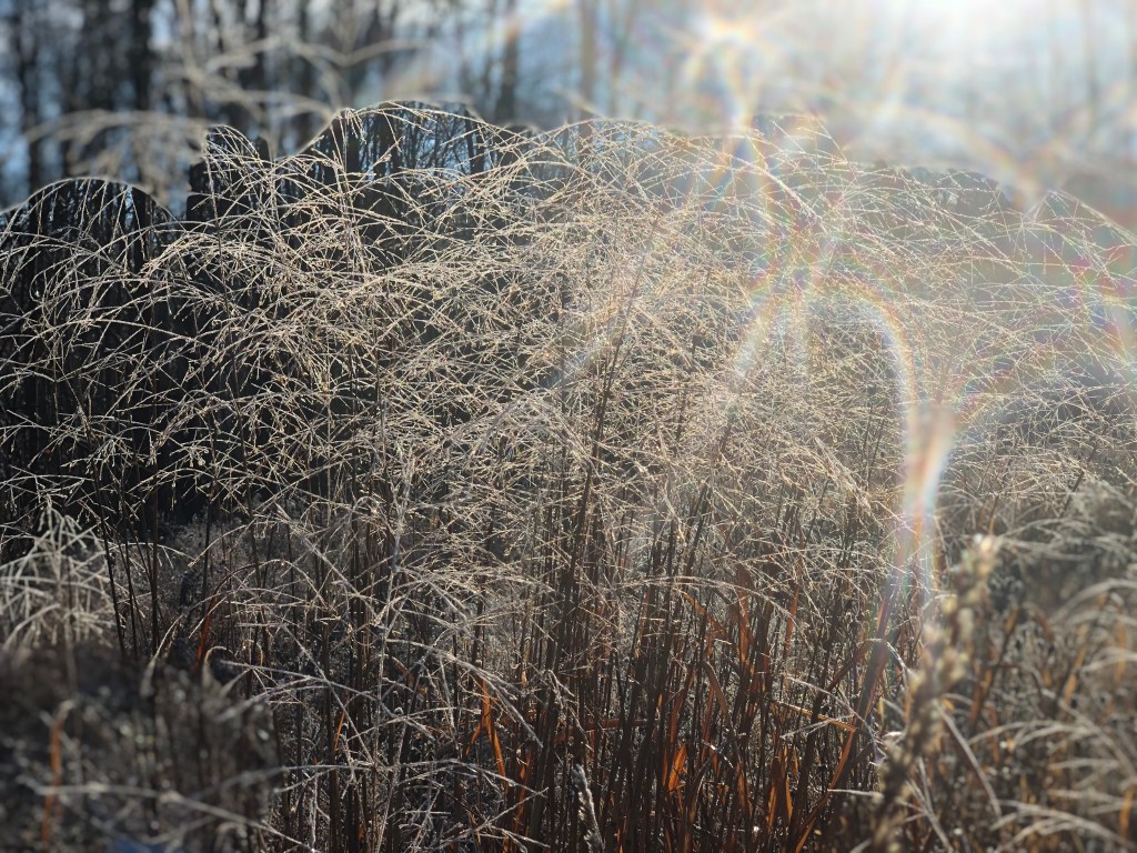 After many cloudy, rainy days the sun was such a welcome sight and I ran all the way back with my face to it. I captured a few more photos of some of the frost still covering some weeds with the sun and dew in the background.